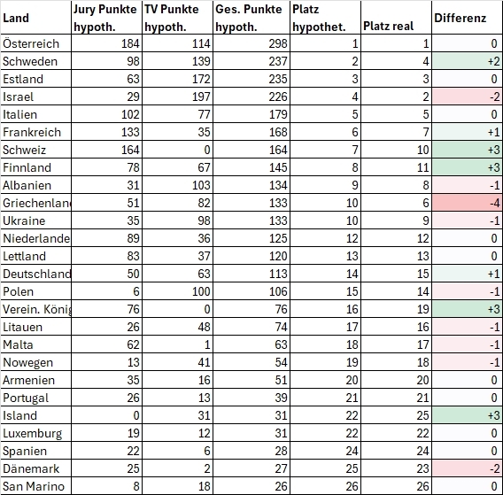 Auch so hätte Österreich gewonnen. Israel hätte hingegen zwei Plätze schlechter abgeschnitten, Estland und Schweden zwei Plätze besser. Am meisten profitiert hätten Island (plus 6 Plätze) und die Niederlande (plus 5 Plätze). Extrem abgerutscht wäre kein Land, die größten Verluste betrügen 3 Plätze für die Schweiz und Portugal.